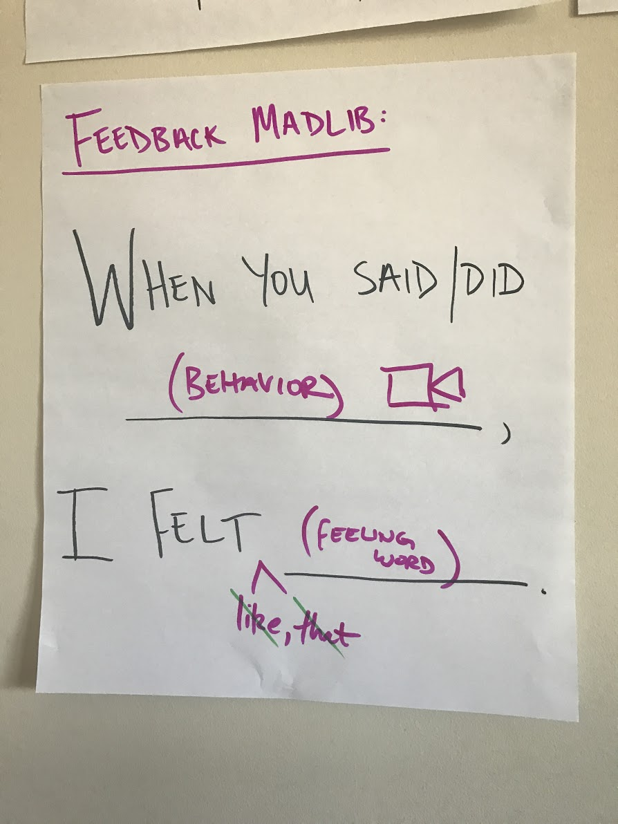 This “formula” (or “mad-lib” or fill-in-the blank”) is a great place to start with interpersonal feedback because it will help you ensure that your feedback comments STAY ON YOUR SIDE OF THE NET and draw from your area of expertise: your feelings.